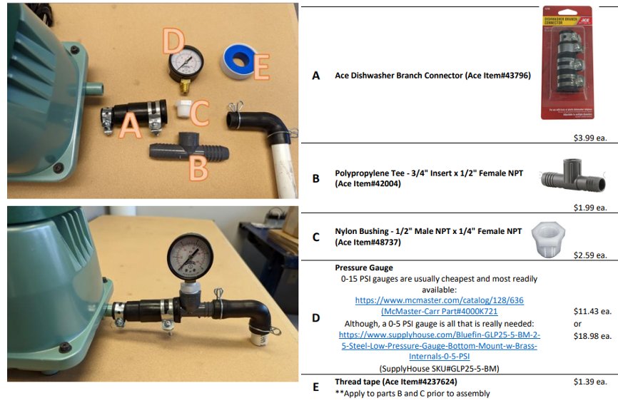 Testing the system pressure after installation and periodically after can increase the life of your aerator. We suggest checking every 6 months. An increase in pressure can mean that the diffuser has clogged, or the depth of the water has increased. If the reading is low, you may have a leak in the airline. Below is a picture of a DIY pressure gauge kit. It is best to remove the gauge after each use or the gauge will likely wear out very quickly.