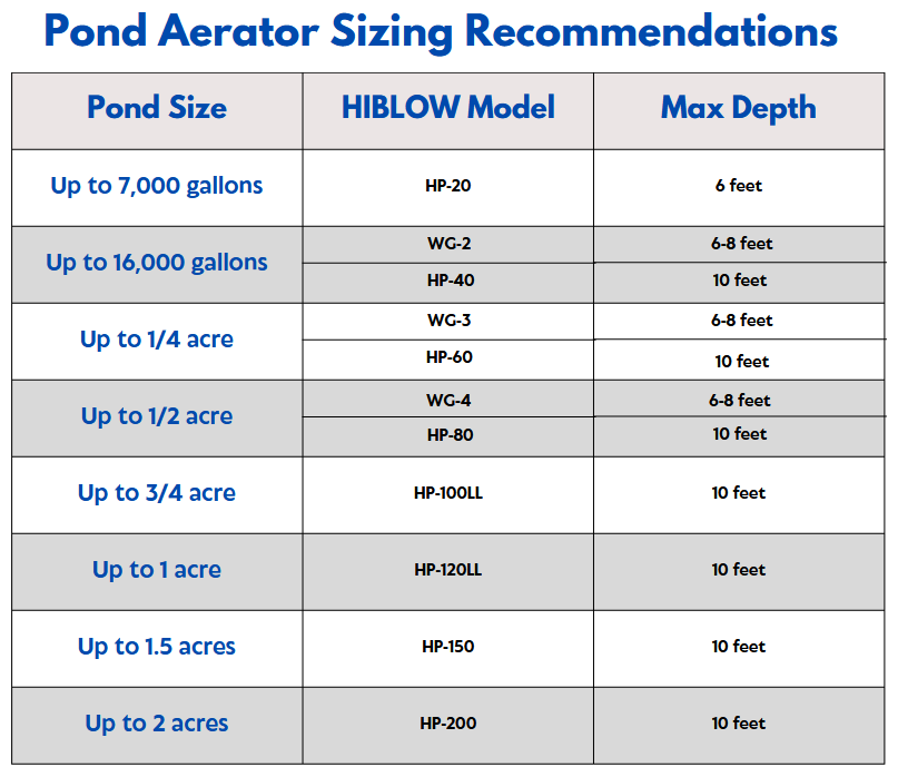 If you have any questions about choosing the right size pond aerator, please give us a call at 734-944-5032 or email us at info@hiblow-usa.com