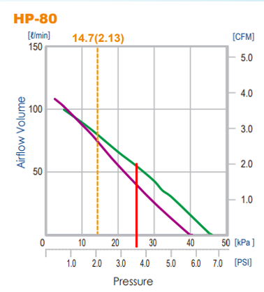 To keep things simple, let’s assume that I’ve already gone through step 3. I’ve determined that my total backpressure is 3.8 PSI. I have a ½ acre pond that is about 8’ and would like two diffusers that need 30 LPM to “self-clean”. I’m looking at the HP-80 performance curve first. In the graph below, the red vertical line (from 3.8 PSI) hits the green curve at about 2 CFM or 55 LPM. If you were to split the flow to two diffusers, you would get about 27 LPM to each diffuser, which is lower than the target.