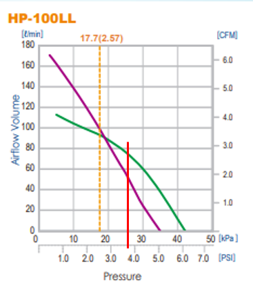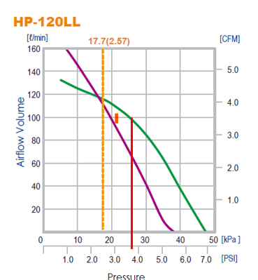 If I decided to bump it up to 3 diffusers for some reason, the HP-100LL wouldn’t be enough flow. Let’s look at the HP-120LL graph below. At 3.8 PSI, the HP-120LL puts out about 100 LPM, so that would be my choice if I needed 3 diffusers.